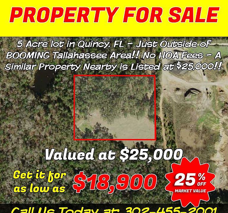 5 Acres in Quincy, FL – Mobile Homes Permitted. Sold Comps Range from $25,000 to $30,000. BUY TODAY CASH FOR $18,900!! Or $4,999 down and $371/mo Worth $27,500 Selling at nearly 70% of Market Value Property Summary Incredible 5-acre lot in Quincy, FL. Just 35 minutes right out of Tallahassee. Highway just 5 minutes away. Beautiful lot in a newly developed neighborhood. New houses around you. But enough space to be on your own. Come to build your dream house, bring your mobile home, or just enjoy camping in the woods. It’s perfect for those who want to live in a nice and quiet environment. Property City Quincy is a Florida Main Street Community and has a beautiful downtown area loaded with old historic buildings, restaurants, and shops. There are quite a few “Coca-Cola” millionaires in Quincy. The town is a good family town even though it is small. There are areas with homes that have been here for years but are well kept. There is a good sheriff that keeps crime down in all areas and the people are friendly. Property Value The Market Value of this BEAUTIFUL lot is around $25,000-30,000. Based on recent property sales in the area. We offer this property for only $18,900, which saves up to $8,600!! Property Details APN: 3-03-2N-3W-0000-00134-0200 Property Type: Acreage Zoning: Rural Residential County: Gadsden Property Address: Post Plant Rd GPS Coordinates (Approximate Center): 30.602927, -84.519285 City: Quincy Zip: 32352 Acres: 5 Square Feet: 217,800 Topography: Flat Mobile Homes Allowed: Yes Nearest Cities or Subdivisions: Quincy Havana Gretna Annual Taxes: $185.76 Utilities Power: Not connected Water: Not connected Sewer/Septic: Not connected Purchase Options Cash Price: $18,900 We are currently offering this property at a rock bottom cash price of $18,900. This is the deal of a lifetime, don’t miss out on this great opportunity! Owner Financing option: just $4,999 down, $699 doc fee, and $371/mo for 120 months Ask as for more seller financing options. We can make nearly everything possible for you. Local Amenities Local Schools Include: Stewart Street Elementary School Crossroad Academy Charter School Gadsden County High School Closest Grocery Stores: Walmart Supercenter Harveys Supermarket Salem Grocery Local Restaurants: Summers Smokehouse Mayflower Chinese Restaurant Maryland Fried Chicken Local Attractions: Gadsden Arts Center and Museum Greensboro Railroad Museum Fun Station READY TO BUY OR HAVE QUESTIONS? Purchasing property from us is simple and easy. We have closed hundreds of real estate transactions and know the process well. We ensure a title that is free and clear. For all Cash transactions, we work together with an official and local title company or title attorney for your maximum safety. Disclaimer The buyer is responsible for verifying all information with the County as to what can and can't be done with the property. The buyer will need to work with the County to obtain the proper permits if needed. The buyer will also need to confirm the availability of any utilities needed or serviced on the property. Seller makes no warranties or representations about the land, its condition, or what can be built on the property.
