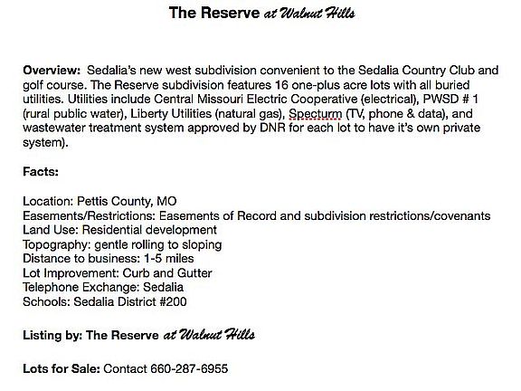 The Reserve at Walnut Hills: Sedalia's new west subdivision convenient to the Sedalia Country Club and golf course. One plus acre lots for sale. In Pettis County, approx. one mile from city limit. Lot prices vary--avg. is $63K. Sedalia School District #200.