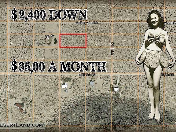 This property is midway between Joshua Tree and 29 Palms in a sparsely populated residential area. It has a rockin view of the Joshua Tree National Park border. When you go out note that there is an unnamed road that borders on the east side of the property, this will help you visualize the borders. To purchase this property on terms we require $2400 Down and a Flat Rate Escrow Fee of $492. So your total Start Up Cost for the land on Que Pas Lane is $2892. You can then choose either a 5 year loan ($197 a month), 10 year loan ($120 a month) or a 15 year loan ($95 a month). We conduct a traditional escrow with title insurance. We do not require a credit check. Don't have the Down Payment? Look into our Down Payment Program - Only $291 to start Owning this Land at on Que Pas Lane Today. More info at desertland.com/QuePas.