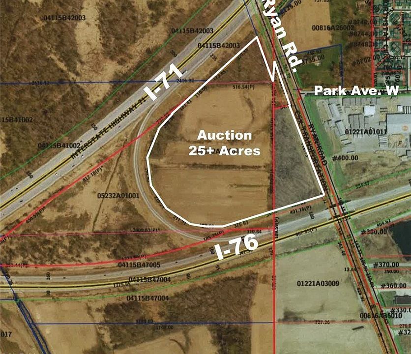Attn: Land Seekers & Developers - 25+-Acres Commercial & Development Land - Medina Co. – Zoned I-1 Industrial – Utilities Available - Bordered By I-71, I-76 Plus 1,400+ Feet Frontage On Ryan Rd. - ABSOLUTE AUCTION, all sells to the highest bidder on location: MONDAY - OCTOBER 16, 2017 – 12:00 PM - 25.19 acres total – 2/3 being farmed, balance wooded. 1,400’ frontage on Ryan Rd. Sewer & water on east side of Ryan Rd. Mineral rights transfer. Bank owned, better check it out. Parcel #052-32A-02-003; 052-32A-02-001; 051-32B-03-001; 051-32B-03-002; 012-21A-01-098. TERMS ON REAL ESTATE: 10% down auction day, balance due at closing. A 10% buyer’s premium will be added to the highest bid to establish the purchase price, which goes to the seller. Any desired inspections must be made prior to bidding. All information contained herein was derived from sources believed to be correct. Information is believed to be accurate but not guaranteed.