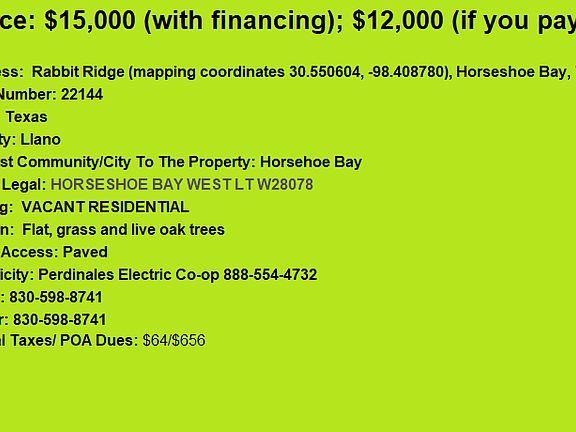 Beautiful lot on cul-de-sac close to Applerock golf course. Nearby lots of similar size on the golf course selling for $21,000. Buy today for as little as $9,000. Financing available also. Property is located at Rabbit Ridge (mapping coordinates 30.550604, -98.408780), Horseshoe Bay, TX 78657. All utilities available underground including cable TV on this developing street. This quiet, cul-de-sac is near hole #5 of the Applerock Golf course. Houses on this street are valued at $300k-$400k. Other lots are listed for sale near the golf course but not touching it are listed for sale near $21,000. We are listing this for sale for cash for $9k (over 45% discount). This lot can also be financed as well. Property is located in the City of Horseshoe Bay in the Applewood Subdivision. This neighborhood is next to Lake LBJ where you will see people boating, kayaking, jet skiing, wakeboarding, water skiing, sailing, and swimming from spring to autumn. Horseshoe Bay boasts three 18–hole championship golf courses personally designed by world–renowned golf course architect Robert Trent Jones, Sr., who himself ranks this complex"among the best in the world." All three courses have been consistently placed among the top one percent of all resort courses in America. There is also a private park consisting of a swimming pool, tennis courts, and recreation area for the private use of Horseshoe Bay Applehead owners. There is also a private airport able here. The city of Horseshoe Bay has been taking city taxes to actively put in new streets, updated police department, new city hall, renovated community center, and upgrading all the golf courses. This is a vibrant, clean, and cared-for area that is growing quickly. So many first-class amenities. This is a very popular bedroom community for people working in Austin. Get your lot here and enjoy building your dream home. The county of Llano has many attractions including: -Enchanted Rock with hiking, camping, and climbing. -Fall Creek Vineyards -The Llano River and Colarado River both go through Llano County as well ask Lake Lyndon B. Johnson and larger Lake Buchanan -The famous Bluebonnet Trail is a highway designated as worthy of drives in the spring with a profusion of flowers -Paddlesack Moutain for hiking -Numerous state parks including Longhorn Cavern State Park, Inks Lake State Park, and Grenwelge Park - the small, quaint town of Llano itself with population of 3400 Distances: -nearest grocery is 8 minutes away -12 minutes to Baylor Scott and White Medical Center -Austin downtown is one hour away -Austin airport: one hour 11 minutes -San Antonio: one hour 40 minutes This property can be financed (no credit check) in these various ways: Purchase price of $15,000 + $250 document fee -$500 down (9.9%) and $190 per month for 10 years – total due today $750 -$1000 down (8.9%) and $176 per month for 10 years – total due today $1250 -$2000 down (7.9%) and $262 per month for 5 years- total due today $2250 ***Or*** A substantial reduction in price from market value (over 45% less than than other lots selling) --- only $9,000 + $250 document fee. OWN IT TODAY