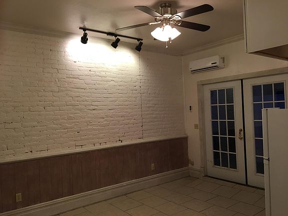 Historical brick walls. Small unit. Open kitchen/living room floor plan. Tiled throughout, custom tile in kitchen and bathroom. Stove, refrigerator and washer and dryer included appliances. Stacked Front loader and dryer available. Ceiling fans in bedrooms and living area, black custom track lighting. French doors throughout with brick walls and wainscoting trim. Granite kitchen sink with Garbage disposal. Small Front yard and back fenced patio. Compact small unit but upper end amenities. All on one level with a a step up to the restroom shower area.