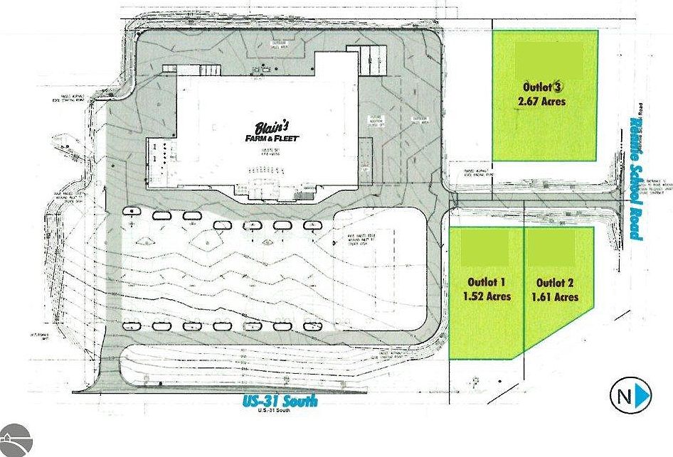High exposure and visibility with large chain retail next door and a high traffic count of 28,739 daily. Three vacant outlots located north of the Chum's Corner intersection of US-31 and M-37 and south of the City of Traverse City in this growing area of Northwest Michigan. New stoplight at Rennie School Rd and US-31 provides safe and easy access. Clear, level, and ready to build with public water and sewer.