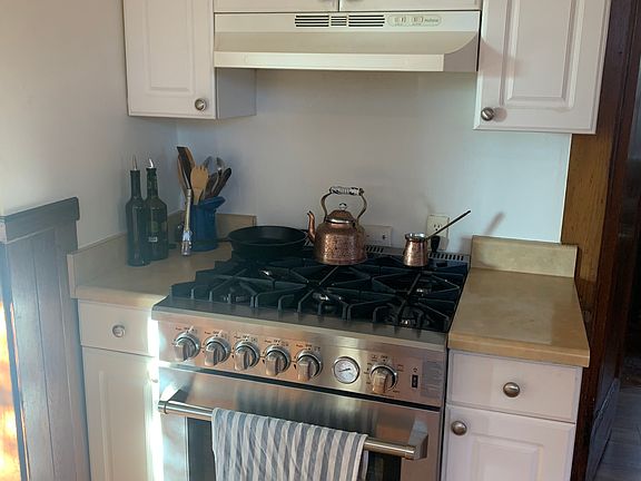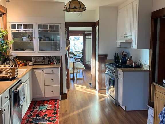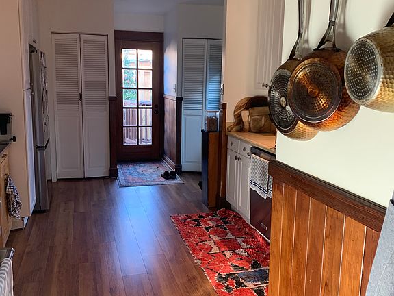 The kitchen opens to a large redwood deck and private yard. There is room for 1 car in the driveway in front of the side gate, and room for another car if needed behind the gate.