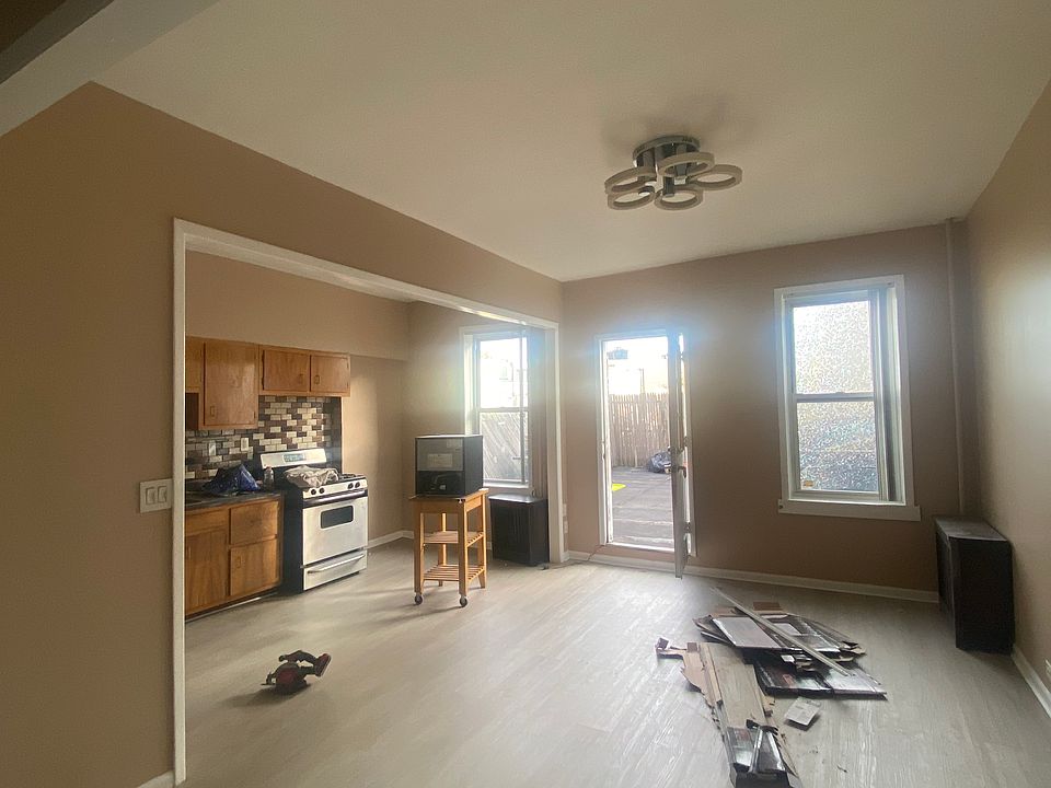 Apartment is freshly painted, It features new flooring, lots of natural light, new refrigerator, good closet space, open concept kitchen, dining room, high ceilings