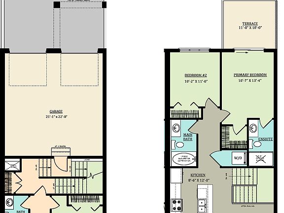 - 1,539 Sq. Ft.- Covered Front Porch- 3 Bedroom Two-Storey Townhome- 9'-0" Ceiling Height on Main Floor, 9'-0" Ceiling Height on Second Floor- Granite or Quartz Countertops in Kitchen- Large Open Kitchen featuring an Island with an Extended Breakfast Bar- Engineered Hardwood Flooring in Living Room, Dining Area, Kitchen, and Second Floor Hallway- Tile Flooring in Foyer, Bathrooms, and Laundry Room- Dining Area opens to a 10'-6" x 5'-0" Balcony- Primary Bedroom with Walk-In Closet and Private 3-Piece Ensuite- Primary Bedroom opens to a 11'-0" x 10'-0" Terrace- Second Floor Laundry Closet- Attached 21'-1" x 22'-0" Garage with inside entry- Central Air Conditioning