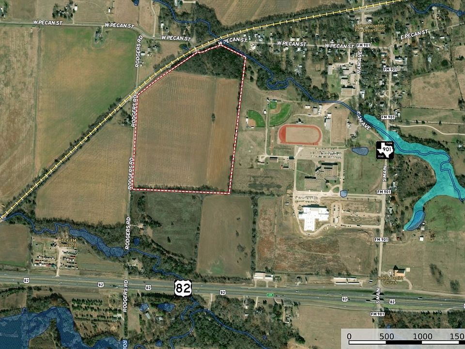 Acreage situated on the east side of Rodgers Road, one-quarter of a mile north of U.S. Highway 82. Level acreage next door to the S&S Consolidated high school and middle school, partially in the city limits of Sadler. 1,267 feet of frontage on Rogers Rd and some frontage on West Pecan Street. Close proximity to a median break in U.S. Highway 82 making the property highly accessible to Interstate Hwy 35, U.S. Hwy 377, State Hwy 289 (Preston Rd) and U.S. Hwy 75 (Central Expressway). Union Pacific Railroad frontage along the northwest part of the property. Ag Lease and Ag Tax Exemption in place.