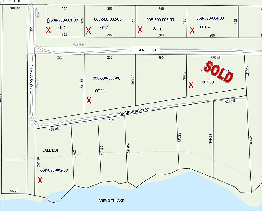 This Lot #2 on map and is one of 6 lots available in this location. There are a total of 4 lots available on Rogers Road Lots 1,2,3,4 and there is one lot available between Rogers Road and Raspberry Lane Lot 11. There is also a lake lot available on Raspberry lane that is 165.05 x 244.86