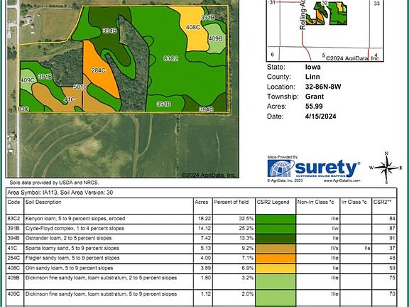 This is an attractive 73.52-acre, Linn County farm with a mixture of timber and productive farmland. This would make a nice building site in rural Linn County. Primary soils are Kenyon, Clyde-Floyd and Ostrander. CSR2 on the 55.99 FSA/Eff. crop acres is 76.40. See soil map for detail.