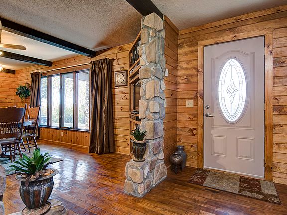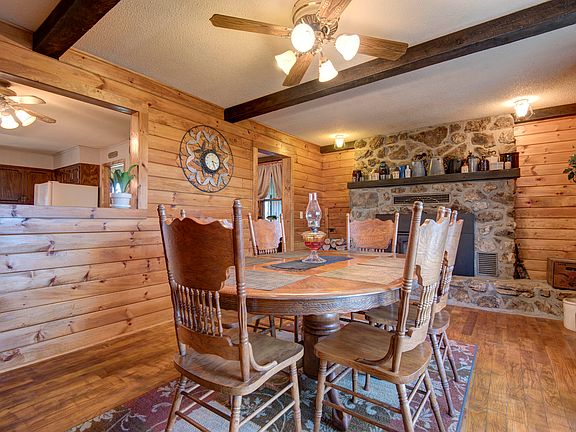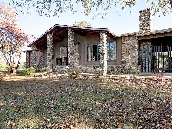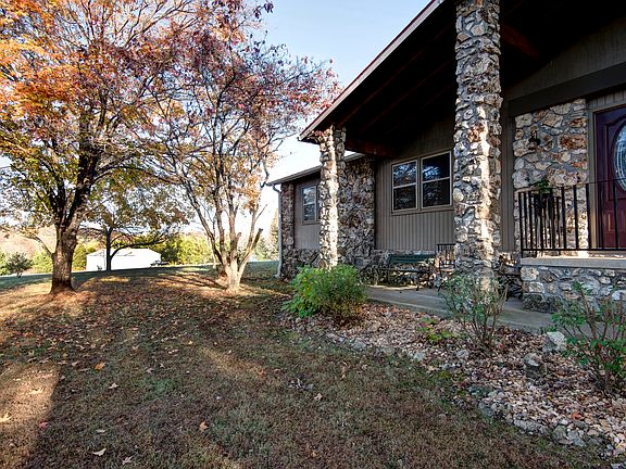 Hidden Ozarks beauty off Hwy 5, near Fox Trotters world headquarters on manicured 2 acres+/-. Several fruit & nut trees, gardens and beautiful trees. Room for animals, no restrictions. Rustic home with stone, solid oak floors, oak framing, timber beams, tile and wood doors and trim. Low utilities with full stone wall wood burning fireplace, and cozy wood burning stove in family room. Lots of windows throughout with quiet country views. There is a breezeway with new custom iron gates that lead to an immaculate 4 car shop builidng. Also a 30 x 36 concrete floored/electric outbuilding, and a 14 x 24 covered patio & covered front porch. All appliances convey and home is move in ready. Sellers want to relocate before winter. Quick occupancy. Minutes to Wal-Mart and conveniences.