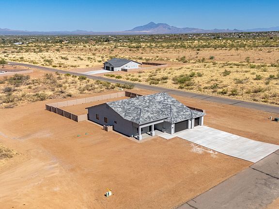 Custom Sun Canyon Home in the Ranchos San Pedro subdivision. 4 bedrooms, 3 baths and 3 car finished garage with epoxy floor finish . 10' ceiling at great room and dining area with 16' sliding glass door to patio. Kitchen includes group D quartz countertops, double ovens, stainless appliances, gunmetal black undermount kitchen sink, upgraded black window frames throughout the house, full overlay cabinets with crown molding white & limeston colors. Tile flooring throughout, block wall around swimming pool. Corner lot on a cul-de-sac. Covered porch with mountain views of the Huachuca mountains and covered patio with views of the Mule & Dragoon mountains. Construction features-2x6 exterior framing,Polyglass premium roof underlayment, R-21 Open-cell foam exterior walls,Tyvek wrap vapor barrier