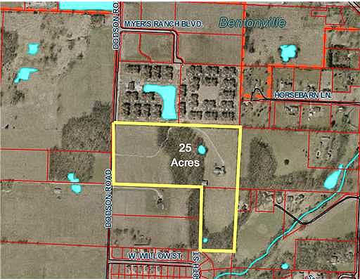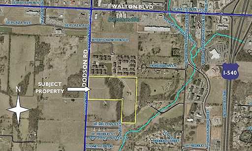 Open, level land with frontage on Dodson Road just south of S. Walton Blvd and south of Myer's Ranch and Parc Apartments. Office and apartment zoning on adjacent properties.