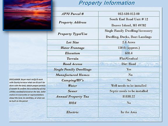Located on S End Road on Beaver Island. Build Your dream vacation home or investment property on this naturally wooded, 150 foot water frontage property! Relax to both the Sunrise and Sunset on Lake Michigan.