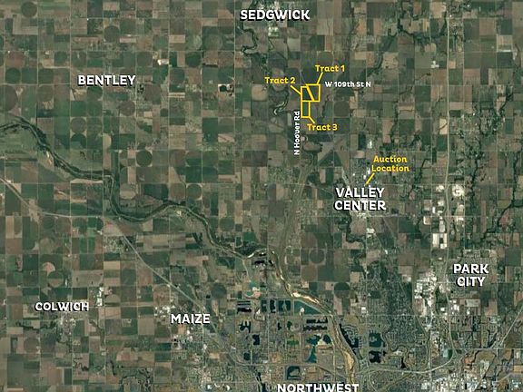 LAND AUCTION - Sedgwick County, KS - IRRIGATED/DRY LAND - SOLD IN 3 INDIVIDUAL TRACTS. Don't miss this exceptional opportunity to bid on three individual tracts of land through our upcoming auction. The event will offer both live and online bidding, granting potential buyers great flexibility. These tracts are all conveniently located in the NW ¼ of 14-25-1W. For detailed FSA information, feel free to request it. Furthermore, the seller's mineral interest will be transferred with the sale, while possession remains subject to the current tenant rights. Tract 1 encompasses irrigated cropland, totaling 69.97 +/- acres. The sale includes a valuable 7 tower Valley system with an end gun, adding to the appeal of this tract. Water rights details are available upon request. Meanwhile, Tract 2 has a total of 75.52 +/- acres, and Tract 3 comprises 78.04 +/- acres. Both tracts offer excellent cropland with high-quality soils, making them highly desirable in this sought-after location. This auction provides an extraordinary opportunity for potential investors looking to expand or start their venture in high-quality crop ground. Each tract will be auctioned individually, with no back-and-forth bidding between them. The bidding will follow a per-acre basis, based on the acreage stated in the brochure. Additionally, a 10% buyer's premium will be applied to the final sale price. To calculate your total purchase price, simply multiply your bid amount by the number of acres and add the buyer's premium. Join us for the auction, offering live bidding and live-streamed video and audio for online participants, on Thursday, November 2nd, at 11:00 am. The event will be held at LaVenue - 109 W Main St, Valley Center, KS 67147. This is your chance to make a sound investment in prime agricultural land. The property is selling in a “Where Is, As Is” condition without any warranties of any kind. Sale is subject to seller confirmation with closing within 30 days. The successful bidder shall be required to deposit 10% of the purchase price as earnest money the day of the sale. There is a 10% buyer’s premium that will be added to the final bid price. Auction will be held on site with live and online bidding. All information was obtained from sources believed to be correct but is not guaranteed. Buyers shall rely on their own due diligence of the property and records. All announcements at the Auction take precedence over any printed or advertised material. The property will be sold subject to any applicable Federal, State, and/or Local Government regulations. All acreages, measurements, and other details described are approximate and may not be to scale. The winning bidder must be available immediately following the auction. Auctioneer provides no warranties concerning the online bidding platform's performance and accepts no liability for any damages incurred by bidders during its use, including issues like unacknowledged bids or bidding errors. Bidders are responsible for any risks associated with using the online bidding platform.