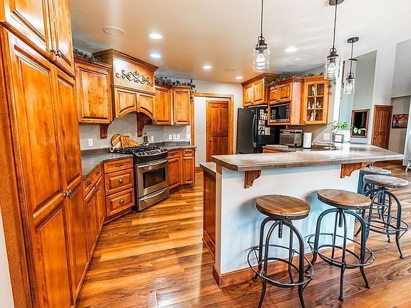 Experience the excellent craftsmanship in this beautiful home! Open covered front porch. Entryway with slate flooring. Custom kitchen cabinetry & woodwork throughout showcase the quality & attention to detail. A cook’s kitchen with gas stove, new dishwasher, ample cabinet & counter space, pantry, & dining area w/patio doors to back deck for easy entertaining. Great Room features gorgeous floor-to-ceiling woodburning fireplace & large windows with an open balcony to additional bedrooms upstairs. Primary suite on main level with tray ceiling, double sink vanity, step-in shower & large walk-in closet. Two main floor bonus rooms perfect for additional bedroom, formal dining room, office(s) or relaxing reading room/den. Large main floor laundry/mud room. Unfinished lower level with vast storage & multi-purpose possibilities. Oversized attached two-car garage plus detached two-car garage/shop & garden shed. Apple trees. New Mound System. Call today to schedule your private showing!