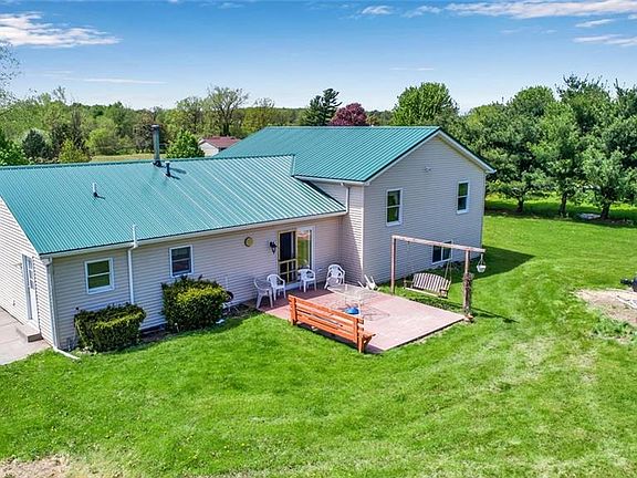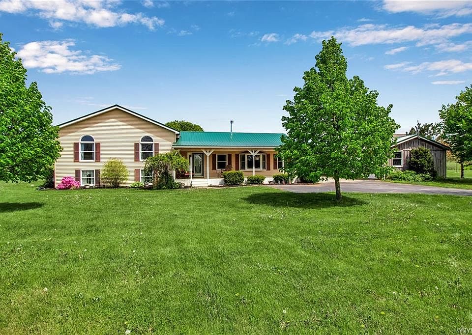 Pride in ownership shines with this lovely 5 bed 3.5 bath split level home w/ steal roof sitting on over 6 acres in Alden! Blacktop driveway ends at concrete pad w/ detached garage/barn (w/ electric). Large covered front porch welcomes you home to your cozy living room w/ wood burning fireplace, ceiling fan & cathedral ceiling. Enter the kitchen w/ plenty of storage, breakfast bar, center island with dining room combo. Dual level basement: upper can be used as additional living space, rec area or office a few steps down are all the mechanics hidden out of the way.