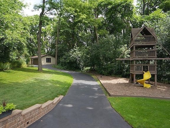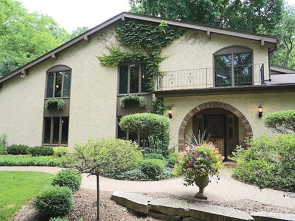 Wow, what a magical setting! Impressive long driveway to your own wooded paradise awaits. California Spanish style home says welcome home. Gorgeous landscape, gardens, fabulous in-ground pool, great play station, 2.5 attached & detached garages with heat & A/C. Open design home brings the outdoors in with magnificent views. Great for comfortable lake country living & awesome entertaining. Granite kitchen, formal dining room with built-ins (used as family room) & much more!