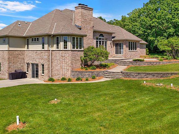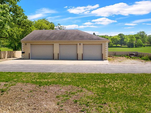 Set back from the road for privacy, this custom built brick ranch on 5.3 acres has nearly 6000 sq/ft of finished living space! The design offers accommodations for family/guests on both the main and the walk-out lower levels. The beautiful foyer entry invites you into the great room and gourmet kitchen with Brazilian cherry wood floors, granite counter tops, stainless appliances, and viewing woods and multi-level patios. Linger in the MBR suite with a 3rd fireplace, luxury bath, and walk-in-closet. Built for the hobbyist, cottage business, or contractor,-the heated 55x45 masonry outbuilding has a storage loft,1/2 bath, A/C, tall garage doors, and separate utilities. With an impressive list of updates, this home is convenient to shops, Kettle Moraine Schools, parks, trails, and shopping.