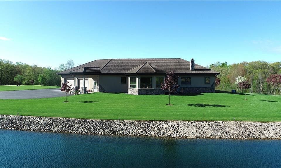 This stunning country estate offers an abundance of beauty, craftsmanship and convenience inside and out. The property is comprised of 33 acres, with 22 wooded acres perfect for hunting. The ICF (insulated concrete form) home provides truly solid construction with amazing insulation. With Geothermal heating & cooling, this home is very energy efficient. Steel shake shingles, maple cabinets & floors, large island w/ seating, separate dining area, granite counters, triple-pane windows, wet bar & fireplace in walkout basement. Plenty of lovely outdoor living space for entertaining. Open concept living area/sunroom overlooking private 1.5 acre pond. The 17 ft. deep pond has a healthy population of walleye,bluegill,crappie & perch. Beyond the home find the 2 spacious buildings (64x32 & 121x44). Larger shop offers bathroom, in-floor heat, modine backup & space to store campers & larger equipment. Enjoy gorgeous views of the country on this quiet road just 30 minutes East of Eau Claire.