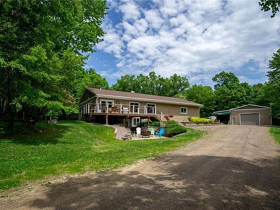 Rare rural property on 60 acres. Beautiful house has been totally renovated. Gorgeous spa bathroom with soaking tub and stand up shower with dual sinks. High-End stainless steel appliances, incl. gas range. LL bath recently completed. Egress window for future expansion. Open concept living area to large deck. Every shop lover's dream, heated 30' x 40', smaller shop formerly used as sugar shack for syrup making. New Septic for 4 bedrooms in 2019. Trails to hunting stand. Come watch the wildlife. Depth and length of creek is unknown. Siding is LP Smart Siding. Home is pre-inspected. Home is 2 miles from Lake Eau Claire.