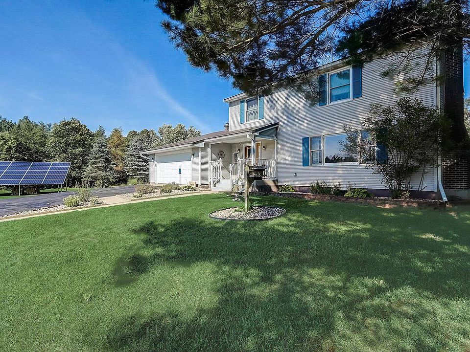 Set upon nearly 8 acres of countryside, this charming country home is a haven of tranquility. Surrounded by nature, the property features a 24x50 outbuilding with elec and plenty of room for all of your toys. The home offers an expansive country kitchen with ample cabinets and an area to easily add a large island. Adjacent to kitchen is a large rec room, or office with a wall of windows. Your sun room leads to a large deck and your in-ground pool for great entertaining and hours of fun. Fireplace in Living room offers a cozy retreat with panoramic views of nature. Upstairs has 4 generous sized bedrooms. Solar panels make this home super energy efficient. Outdoor spaces are abundant, perfect for relaxation and reflection. Don't lose this home! Mid-Sept close possible.