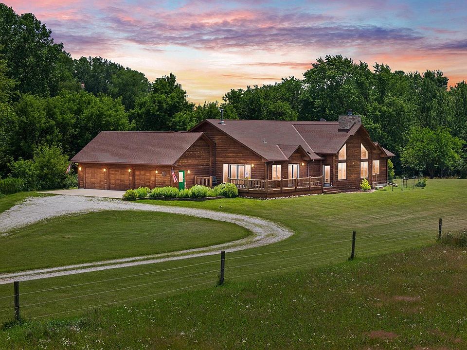 HORSE FARM. Did you like watching Yellowstone? Then you will love this. Not as big. But just as cool. This 3000 sq ft plus log ranch home has 21 acres of fenced pasture land, a horse barn with 8 box stalls and 2 ponds.Conveniently located off of Hwy 83 just past Wales you'll find this spectacular log sided ranch home. The Great RM is magnificent w/ the towering stone fireplace, soaring wood ceiling and polished wood floors. The kitchen is designed for the cook with a commercial quality SS stove, tons of granite counters & hickory cabinets. The private main bedroom is huge w/ wood beamed ceiling, large WIC & luxurious bath. The home features 10 RMs, 3 BR's, 2.5 BA's and a 3.5 car attached garage. Heated floors throughout the entire home. Barn could be converted to store 10 plus cars.