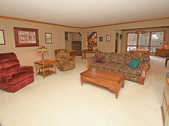 Amazing open home, set on a spectacular 3 acre lot on top of the hill for stunning views. From your main floor master, enjoy relaxing in your expansive 4 season sun porch. The bath has been luxuriously upgraded and won't disappoint. The home is airy and bright, with additional windows added to make the most of the views. The lower level has high ceilings and walk out. The kitchen is open and bright with lovely granite and deck that overlooks wooded trails, a perfect place to relax. Living room has an amazing fireplace. Lot has hills, woods and flat open areas, and a large custom shed.
