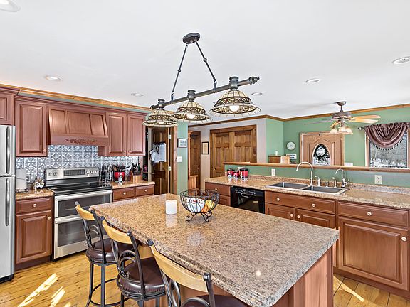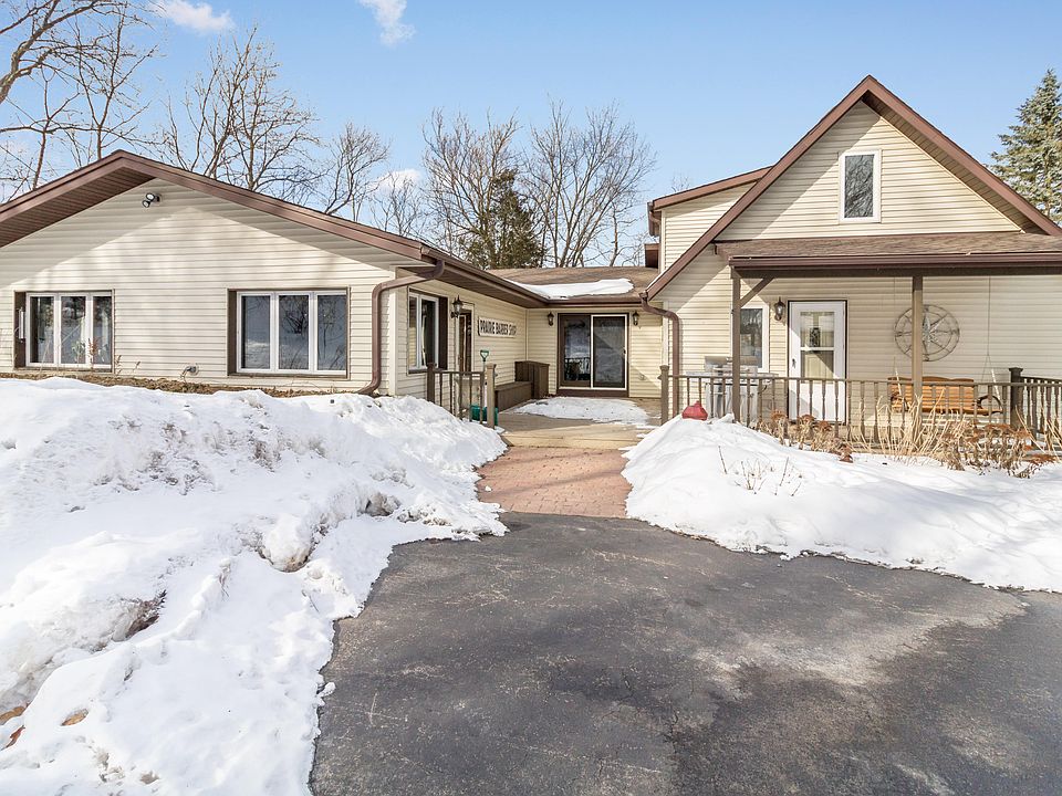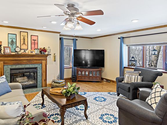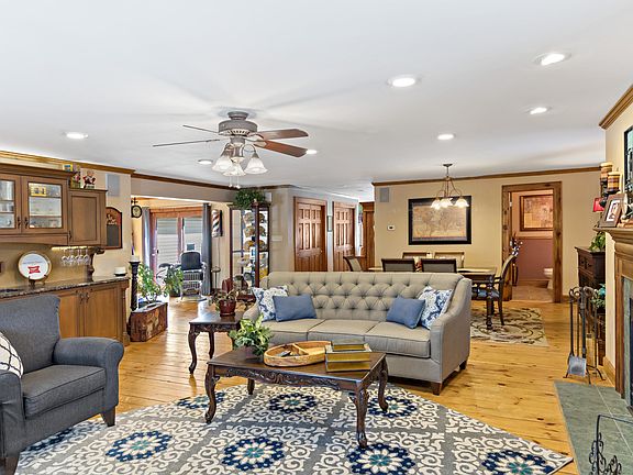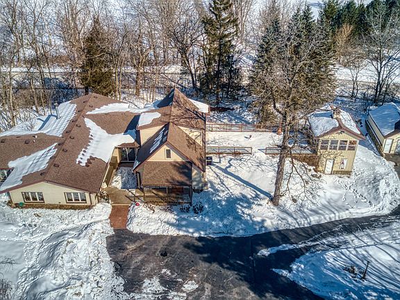 Charm and character abounds in this beautiful custom cape cod home set on picturesque 5.8 acre lot. This updated home feature a cooks kitchen with large center island, walk-in pantry and all appliances included! Huge Great Room with natural fireplace, built-in wet bar, open concept to formal Dining Room making this the perfect entertaining space. Private Master Suite with his & hers walk-in closets, separate shower and whirlpool tub. Main floor laundry. Upper level features private 3rd Bedroom and walk-in attic storage. Tiled floor in basement perfect for exercise area or flex space. 1 attached garage space, plus room to park 10 add'l cars in detached garages and one with a 12' overhead door. Heated garage. Outdoor sun room off deck-- perfect for those summer days. Private wooded lot.