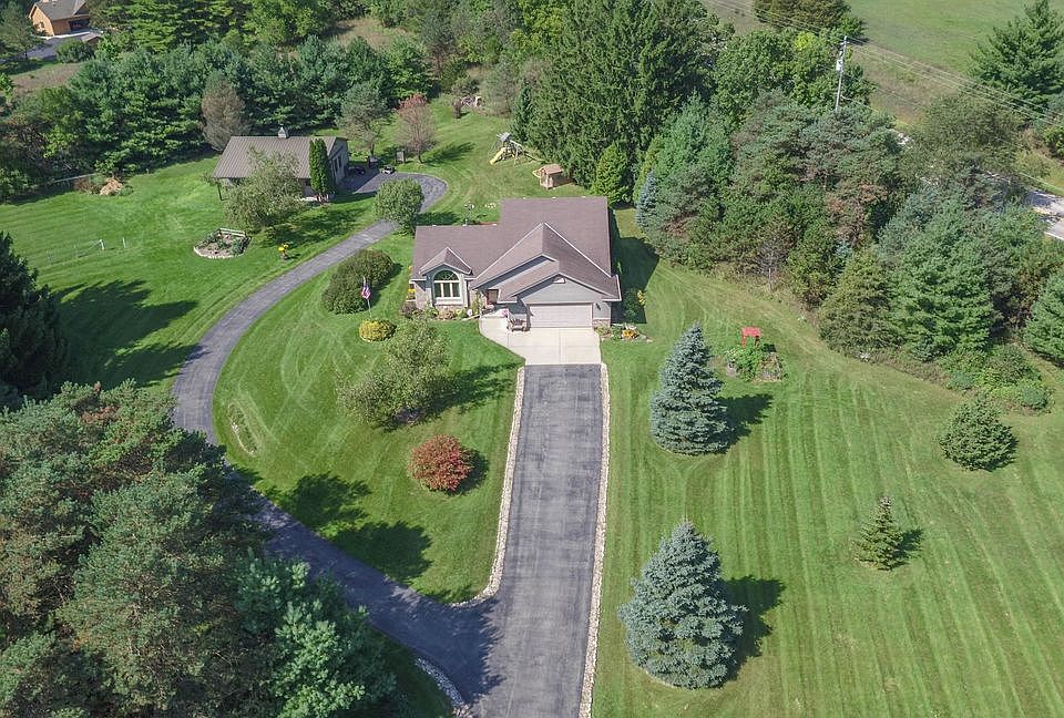 Welcome Home to your Private retreat in Kettle Moraine Estates! Enjoy the 3 plus acres of woods, a walking trail, pasture, and plenty of deer and other wild life too! Bring your horses! Separate Driveway to Amazing 38 x 30 1140 sq ft Morton 2 Stall Horse Barn with tack room or workshop and loads of storage! All new windows and LED lighting/fixtures throughout! Newer water heater. Sewage lift pump only 4 years old, and tank alarm too!Generous room sizes. Eat In kitchen with skylight, garden window, all appliances and door to patio overlooking back yard. Living room offers cathedral ceilings and a floor to ceiling gas fireplace. 2nd gas fireplace and built in book case in family room as well! Do not miss this opportunity! Schedule your private viewing today!