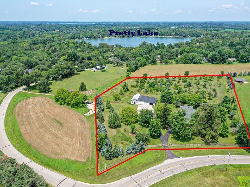 Fully fenced property w/outbuilding on over 5 acres! This 1800's farmhouse, renovated in 2009, blends classic charm with modern amenities. Large 2-story FP w/heatilator & gas log starter. GR flows into spacious kitchen. Alder cabinets, copper sink, Viking refrigerator & range w/pot filler, & Kohler fixtures. Main floor laundry has stacked washer/dryer, sink & additional storage. Primary BR offers sitting area & WIC. Finished LL features half BA, rec room & egress windows. Amazing storage space in the approx. 48x65 combo barn/pole barn w/a few old horse stalls. Wander trails on your private land or head to Pretty Lake for a day of boating. Updates since 2022: fenced yard w/electric gate, Kohler vanities, faucets, other fixtures, water softener, remodeled laundry, carpeting.