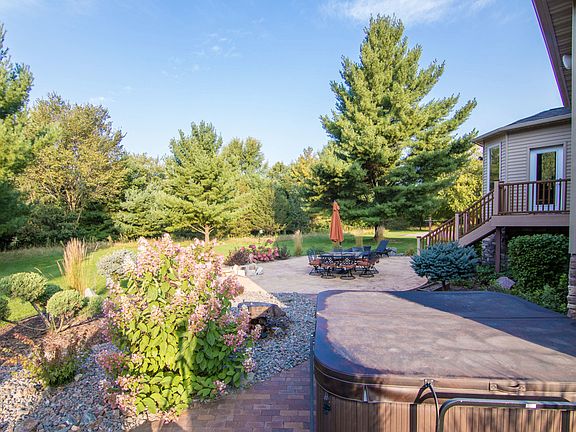 3.3 acre rural location 3 miles from South Eau Claire! This 5 bedroom, 4.5 bathroom, Master bed and bath tucked away on the main level, 4 car garage home. This home has to many amenities to list. Perfect for a growing family including trails, 30x50 sport court and private back yard to entertain. Impeccable landscaping throughout entire yard with brick walkways to each area, hot tub and stamped concrete patio with relaxing fire pit!