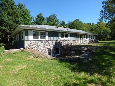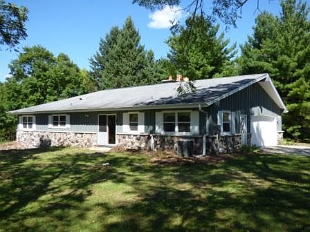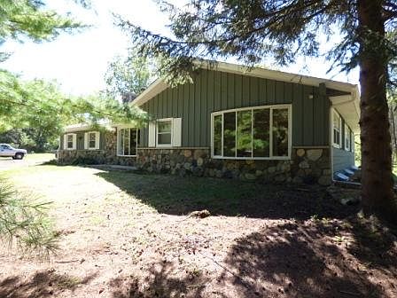 Welcome home to this spacious abode! Kitchen features generous spaces with lots of cabinets,breakfast bar and chefs island.Split mstr bdrm for privacy,living room w/vaulted ceiling,bay window & wall to ceiling stone fireplace.Nice sized bedrooms & 2.5 baths.Par finished Lower level features natural fireplace & 10-stool wet bar included that is ideal for entertaining.Full bath & walk out lower with abundance of space to finish to make it your own.Property sits on almost 2.5 acres, private beautiful wooded lot. Seller is offering a home warranty to you. Make this home yours today!