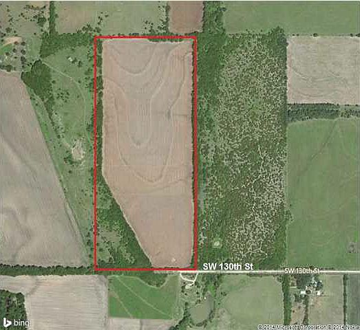 Beautiful property just 1/2 mile from Santa Fe Lake Road. Five miles East and three miles South of Hwy 54 and Andover Road. Excellent building site and very productive soils with significant crop income. Lots of trees for near total seclusion. Rural water meter is available for $4000. Don't miss this rare opportunity to own a beautiful tract of land just a short ride from Wichita. Taxes are estimated because this parcel is part of a larger tract that is taxed as one unit SOLD with additional 60 Acres that adjoined property.