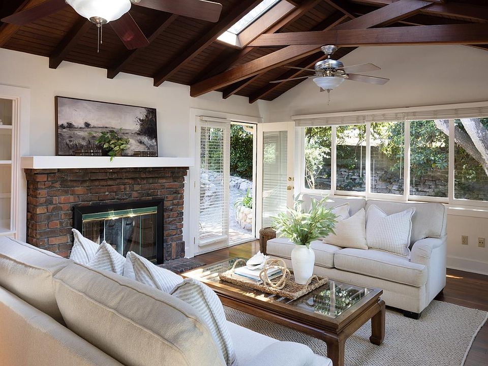 Wood-burning fireplaceMature oak treesBuilt-in cabinetryCharming flower boxesCozy window seatSignature river rock accentsOpen-beam vaulted ceilings