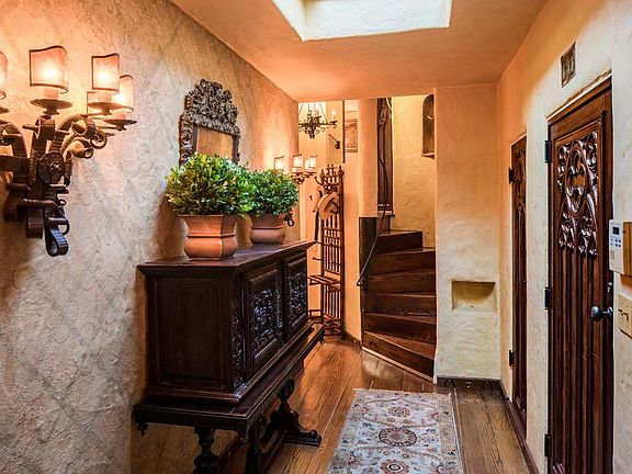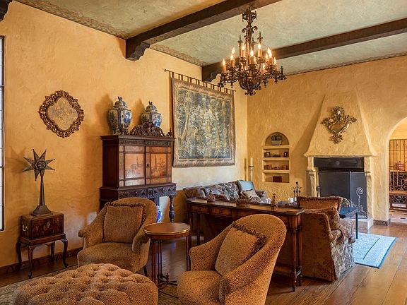 From the minute you enter the "secret" front door, you are transported into another world. Especially in these "unique" times, a special place to call home is even more important. The extra-large living room features high vaulted ceilings, beams and hand painted ceiling reminiscent of grand homes you would find in Spain, Italy or France. This remodeled 1925 gem features hand selected light fixtures, built-in artifacts and cabinetry from Europe which are unique to its architecture. The kitchen is reminiscent of an old-world aesthetic but features modern appliances. Luxuriate in the bay window located in the library looking out at the charming gardens and listen to the courtyard fountain trickling and crashing ocean waves. Curved painted stairways will lead you to two upper guest bedrooms with their own baths or down to the master suite and fabulous master bath both with access and views to the gardens. A separate guest unit is tucked away on the courtyard.