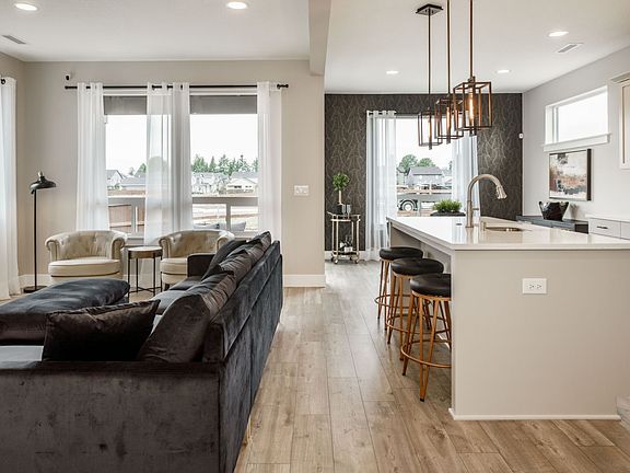 The Powell offers a thoughtful layout for a two-story home where everything is just where you need it. With three to four bedrooms, 2.5 bathrooms, a two- to three-car garage, and 1,775 square feet, you'll find everything you need, plus a variety of exterior options and top quality construction.Thanks to the variety of exterior styles, this home serves up great curb appeal with Craftsman and modern influences. From the front porch, you enter into the home with a dedicated entry that also includes access to and from the garage, perfect for inclement weather. There's also a hall closet in the entry, ideal for coats, boots, leashes, and more.From the entry, you step into the great room that is spacious enough to live up to the name. It is an ideal family hub with room for family members to gather together or have space to do their own thing. Next to the great room is a large kitchen with plenty of counter space, further complemented by the large island with a double sink. To add to the plentiful storage, there's also a walk-in pantry. The kitchen opens into a dining area perfect for family or more formal meals. A sliding glass door off the dining area leads to the covered patio.