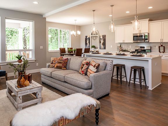Many home buyers prefer a home design that keeps the heart of the living area in the back of the home, offering a greater sense of privacy. The Clearwater smartly arranges each section of the home to provide a balanced layout that will appeal to a variety of homeowners. This two story design, with multiple exterior options, focuses the main living areas on the ground floor, and the bedrooms on the second floor. There are three to four bedrooms, 2.5 bathrooms, a two- to three-car garage, and a total of 2,171 square feet of beautiful living space.The covered front porch is a beautiful welcome to this home. With a transom window over the door and an additional window on the side of the front entry, there is plenty of natural light as you first step into the home. The entry leads into a hallway that takes you past an office space with an optional door for added privacy. Next to the office is a hall closet and a powder room. The hallway then leads into the heart of the home: the open-plan great room, kitchen, and dining area.