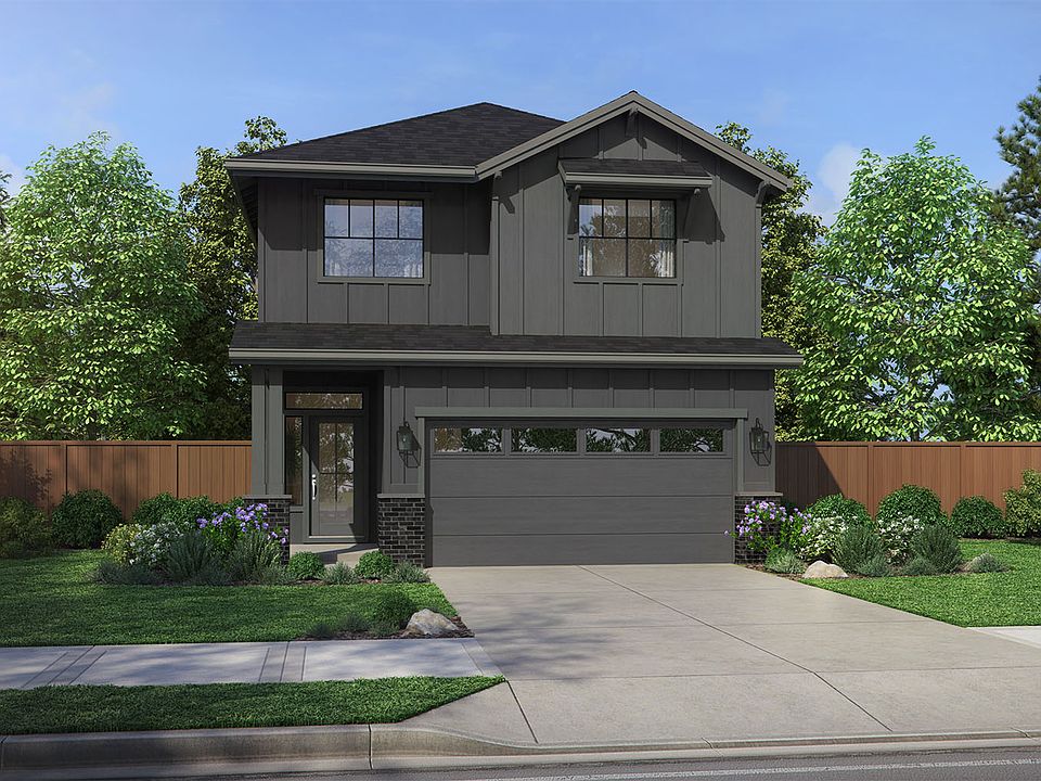 Many home buyers prefer a home design that keeps the heart of the living area in the back of the home, offering a greater sense of privacy. The Clearwater smartly arranges each section of the home to provide a balanced layout that will appeal to a variety of homeowners. This two story design, with multiple exterior options, focuses the main living areas on the ground floor, and the bedrooms on the second floor. There are three to four bedrooms, 2.5 bathrooms, a two- to three-car garage, and a total of 2,171 square feet of beautiful living space.The covered front porch is a beautiful welcome to this home. With a transom window over the door and an additional window on the side of the front entry, there is plenty of natural light as you first step into the home. The entry leads into a hallway that takes you past an office space with an optional door for added privacy. Next to the office is a hall closet and a powder room. The hallway then leads into the heart of the home: the open-plan great room, kitchen, and dining area.