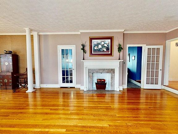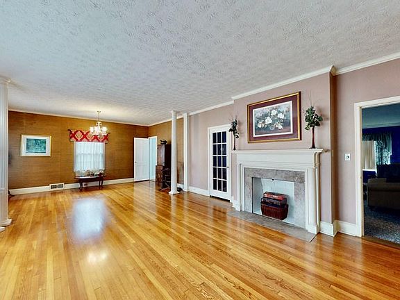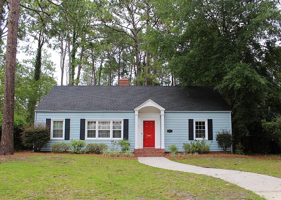 This beautiful blue home with the red door is a classic 1940's charmer featuring details like marble fireplace, columns inside, The kitchen was recently completely redone with gorgeous granite counters, tile flooring, new appliances, and lacquered white cabinets. Bathrooms are updated and gleaming white, with lovely colored tile accents from the 40s. Seven closets downstairs, 2 walk-in closets and a large storage closet upstairs, and a workshop/storage area attached to the 2-car garage in backyard. The original 1942 wood floors are in excellent condition. Even a partial basement that is great for storage! The backyard is secluded, peaceful, and shaded by old growth pines. The upstairs has a balcony where you can step outside and enjoy the view through the trees, or you can sit on the back patio downstairs and enjoy bird watching in the quiet.- In a wonderful shady neighborhood -- a great place for walking and biking among the trees, close to shopping and city center.