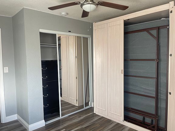 The bedroom is spacious, with large closet with mirrored doors. It comes with a Murphy bed and a dresser, if needed.