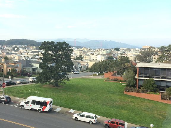 Quiet Laurel Heights Flat, Golden Gate view, garage plus 1 driveway parking, conveniently located near shopping and bus lines, lower unit in 2 unit building, laundry facilities, hardwood floors, updated kitchen, storage