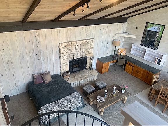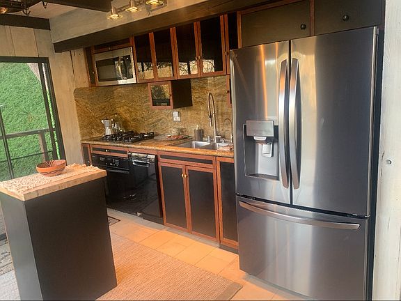 Amenities include stone countertops, stone flooring, new carpet, tiled shower, large deck surrounding the entire second floor area, new appliances, large windows for beautiful views! Private parking area for 2-3 vehicles, and outdoor sitting areas throughout the property. The bed in a few of these photos is not in one of the two bedrooms.