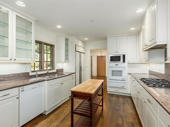 The kitchen includes a Sub Zero side-by-side refrigerator, Dacor convection oven, warming oven and range, Bosch dishwasher, extensive cabinetry, storage and pantry space. A enclosed breezeway houses washer and dryer, and access to a two-car garage (standard height, may not accommodate oversize or high profile vehicles) with generous built-in cabinetry.