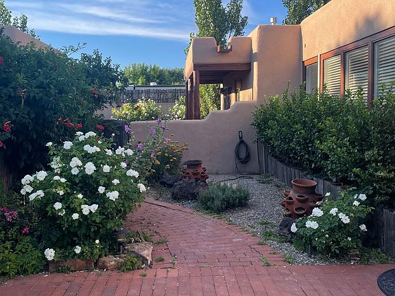 The thoughtfully curated furnishings include a mix of high-quality vintage New Mexican pieces and modern decor. French doors from the bedroom open to a serene, enclosed private garden perfect for morning coffee or evening relaxation. The home also includes a newly updated kitchen and bath, a walk-in shower, in-unit washer/dryer, A/C and heating units, and a freshly re-stuccoed exterior.
