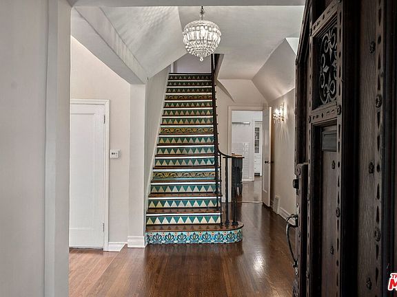 Spanish tile staircaseAntique crystal chandelierThermador rangeFlooded with natural lightArt deco tile bathroomsCorner lotCarrera marble counter