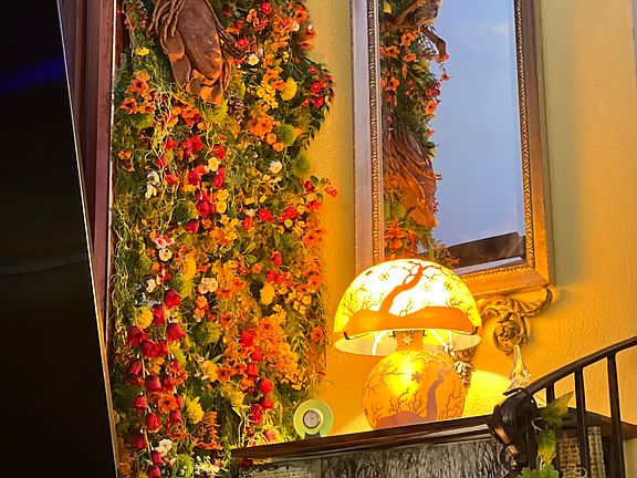 - Ocean facing balcony with faux bark, moss & succulent covered walls, potted plants, and figurines