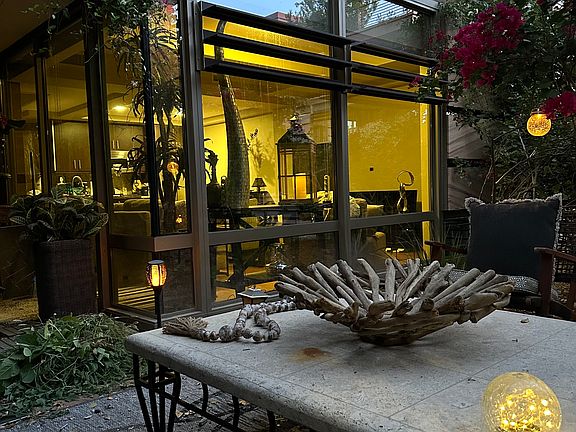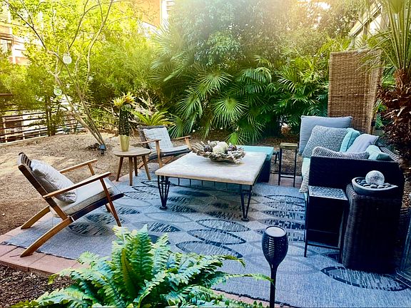 Open concept floor planPrivate garden patioLush landscapingFloor to ceiling windowsAbundant natural lightAdditional sofa pullout bedroom