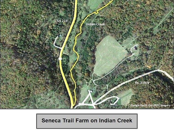 Seneca Trail Farm on Indian Creek, historic Salt Sulphur Springs, WV. This beautiful 21.67-acre property includes over one-half mile of beloved Indian Creek. A push-down one-story house still exists on the property. This is an amazing location to build your dream log cabin or home. Includes big open meadows on the largest end and overgrown fields in the narrow section. A well is believed to exist at the old house; the condition is unknown. Excellent hunting on this tract of land that adjoins the property of the historic mineral water resort.