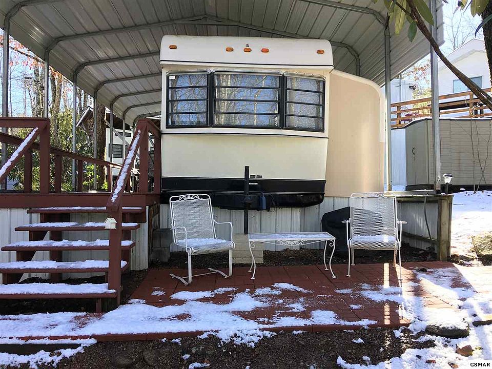 2 Lots 139 & 140 being sold together in Edge of the Smokies with a covered vintage camper with 2 Sliders (one in the bedroom and one in the living room) and an awning on the back. Camper has LED lights throughout the camper. Metal carport structure covers deck and camper. Brand new hot water heater. New wood laminate flooring in living room. New carpet in bedroom. The camper is a 1980 Holiday Trailer. Lot 139 is currently being used as a driveway/side yard with a storage shed on it. These two lots offer privacy and a wooded view that will never be disturbed with 70' road frontage and enough room to build a Tiny House to your specs. No one can build in front of you. This unique community has become a retirees unique way of sizing down, enjoying the Great Smoky Mountains offering a salt water swimming pool, Clubhouse and playground. Plus 2 bath houses on the property and a Hiking Trail that goes into the National Park. Once you find this jewel in the Smokies you will want to make it a permanent home. With two lots being sold together this is possible. A rare find where you can create your own Tiny House and still be in a community that shares value to being retired. Whichever way you decide to go addon, sell off, or keep This unique community offers a salt water swimming pool, Clubhouse and playground. Plus there are 2 bath houses on the property. A Hiking Trail goes into the National Park and more. Summer home or year round living. Worth checking out.