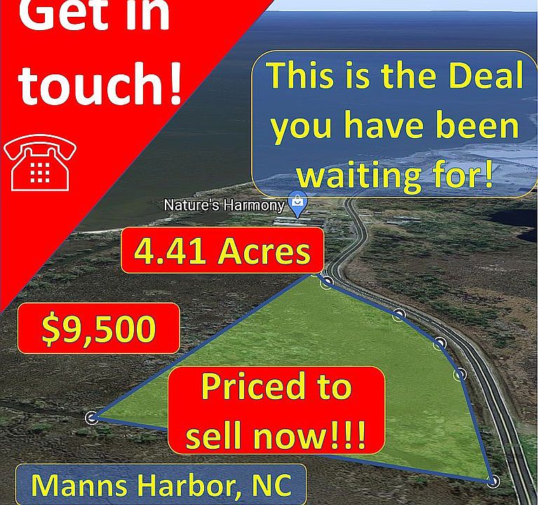 LOOKING FOR THE LAND DEAL OF YOUR LIFETIME? THIS IS IT! THE LAND FOR A DREAM HOME IN MANNS HARBOR, NC Worth $100,000 Selling at 10% of Market Value Whether you’re looking for an investment, property for your business or a place for your Dream Home on the NC coast, this unique property offers wide perspectives. Just south of Manns Harbor, NC, the land is settled on Shipyard RD in a friendly and calm neighborhood, a few steps from the shoreline. This is the perfect getaway from hustling city life. Check it out and feel the peaceful atmosphere this land has to offer! The property is conveniently located. Manteo on Roanoke Island is just across the bridge. Here you find everything you may need: from schools, shops, restaurants to medical facilities. Dare County Regional Airport and North Carolina Aquarium are situated here. This is the land you have been waiting for. Get in touch and check it out! We can only sell it once! Property Summary An incredible 4.41 acre lot in Manns Harbor, North Carolina, which would make the perfect building lot for a business or dream home on the coast. This lot has the potential to rule the world! We are offering this property at a discounted ROCK BOTTOM cash price so that one lucky buyer can own the perfect property at a well BELOW MARKET price. Property Value The Market Value for the BEAUTIFUL lot is a minimum $100,000. Based on recent property Sales in the area. We offer this property for only $9,500, that saves $90,500!!! Property Details ? APN: 23958000 ? Property type: Buildable, single family dwellings or commercial ? Zoning: MH-A ? County: Dare ? Property Address: 0 Shipyard RD, Manns Harbor, NC, 27953 ? GPS Coordinates (Approximate Center): 35.876908, -75.756907 ? City: Manns Harbor ? Zip: 27953 ? Acres: 4.41 acres ? Square Feet: 192,100 ? Topography: flat ? Nearest Cities or Subdivisions: ? Manteo ? Nags Head ? Washington, NC ? Annual Taxes: $71.10 (2020) ? HOA: none Utilities ? Power: power lines at property (Tideland Electric Membership Corporation) ? Water: not connected ? Sewer: septic system can be installed Purchase Options Cash Price: $9,500 We are currently offering this property at a rock bottom cash price of $9,500. This is the deal of a lifetime, don’t miss out on this great opportunity! Interested in our seller financing deals? Please, get in touch and we will work with you to find a plan, that suits your budgeting needs. Local Amenities Local Schools Include: (10 min from property) ? Manteo Elementary School ? Manteo Middle School ? Manteo High School Closest Grocery Stores (within 10 min): ? Food-A-Rama ? Family Dollar ? Piggly Wiggly Local Restaurants: ? White’s (5 min) ? Carolina Bar-B-Que and Seafood Company (10 min) ? Garden Deli and Pizzeria (10 min) Local Attractions: ? Fort Raleigh National Historic Site ? Jockey’s Ridge State Park ? Cape Hatteras READY TO BUY OR HAVE QUESTIONS? Purchasing property from us is simple and easy. We have closed hundreds of real estate transactions and know the process well. We always use a 3rd party title company to make sure our buyers are protected and ensure title is free and clear. Message us here or call us today to get started. Disclaimer Buyer is responsible for verifying all information with the County as to what can and can't be done with the property. Buyer will need to work with the County to obtain the proper permits if needed. Buyer will also need to confirm the availability of any utilities needed or serviced on the property. Seller makes no warranties or representations about the land, its condition, or what can be built on the property.
